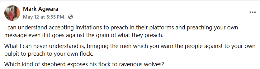 If we juxtapose Pastor Otabil’s words with Pastor Ashimolowow’s, then there is inconsistency in Otabil’s words. He is compromising on his convictions. He is putting on his pulpit a preacher whose theology cannot be put to the test of Scripture. I don’t know much about the other speakers, because I have not followed their ministry. However, looking at other sentiments expressed on social media about the speakers for the conference, it can be concluded Pastor Otabil’s convictions conflicts with the speakers and he is been inconsistent in recent pronouncements. Here are thoughts on the matter from others on social media.